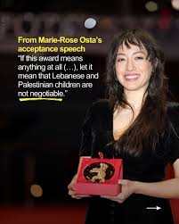 Но, сепак, филмаџиите можеа да зборуваат отворено и факт е дека Берлиналето на крајот, на доделувањето на наградите, заврши со многу политички говори. Еден од нив беше и на либанската режисерка Мари-Роуз Оста, која ја доби „Златната мечка“ за својот краток филм, „Еден ден, дете“. Тоа е приказна за едно момче кое во својата фантазија има супер моќ да ги урива авионите. „Но, во стварноста е далеку од тоа“, рече Оста. „Децата на Палестина и на мојот Либан немаат никаква супер моќ да се заштитат од израелските бомби. Ниедно дете не би смеело да има потреба од супер моќ за да го преживее геноцидот што го поддржуваат вето-силите и колапсот на меѓународното право. Ако оваа ‘златна мечка’ нешто значи, тогаш нека биде порака дека либанските и палестински деца не се предмет на преговори“. Овој говор, по краткиот молк, сепак беше испратен со долг аплауз.